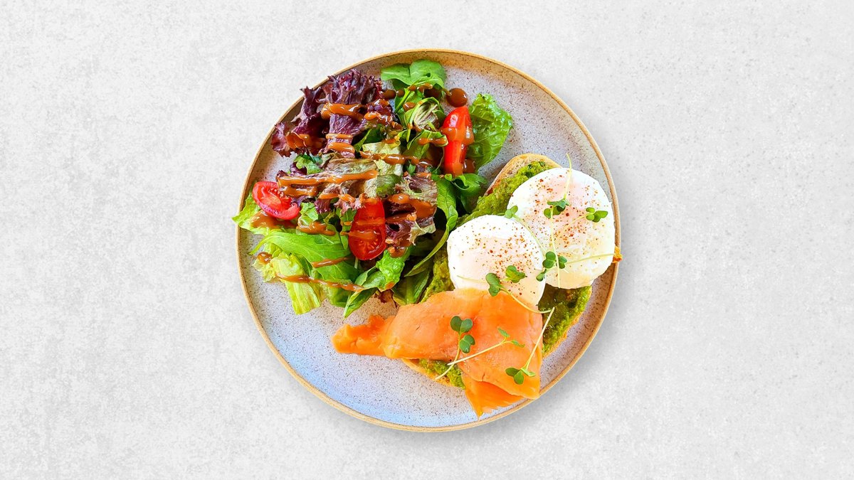 Poached eggs, smoked salmon, guacamole on a sourdough toast bread, served with a side salad