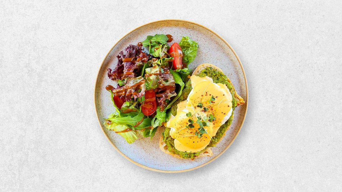 Guacamole, poached eggs, hollandaise sauce, on sourdough toast bread, served with a side salad