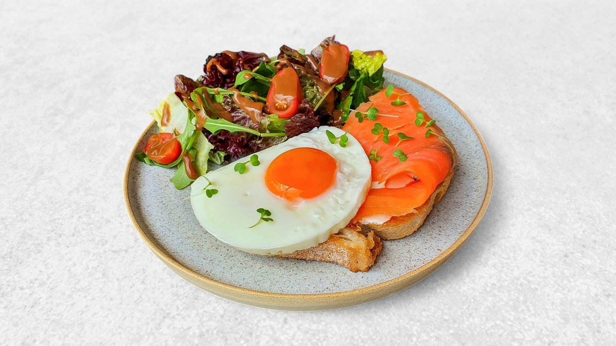Smoked salmon, sunny egg, cream cheese on a sourdough toast, served with a side salad