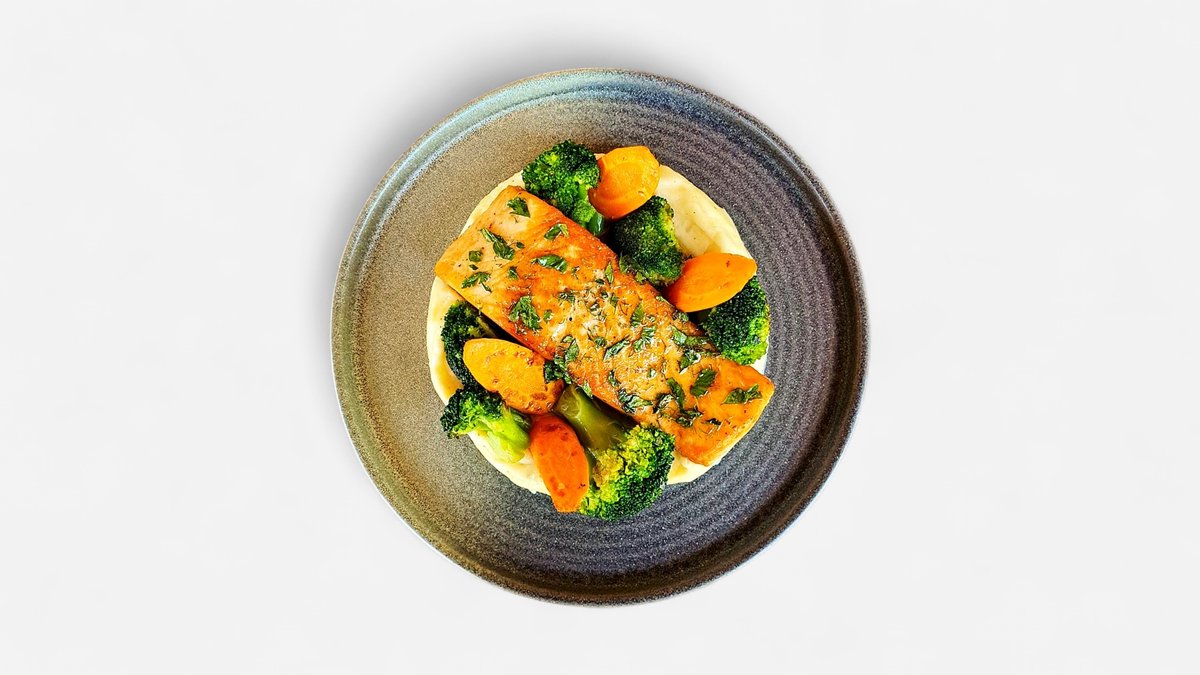 Pan seared salmon, carrots, and broccoli on mashed potatoes, served with herbal butter sauce.