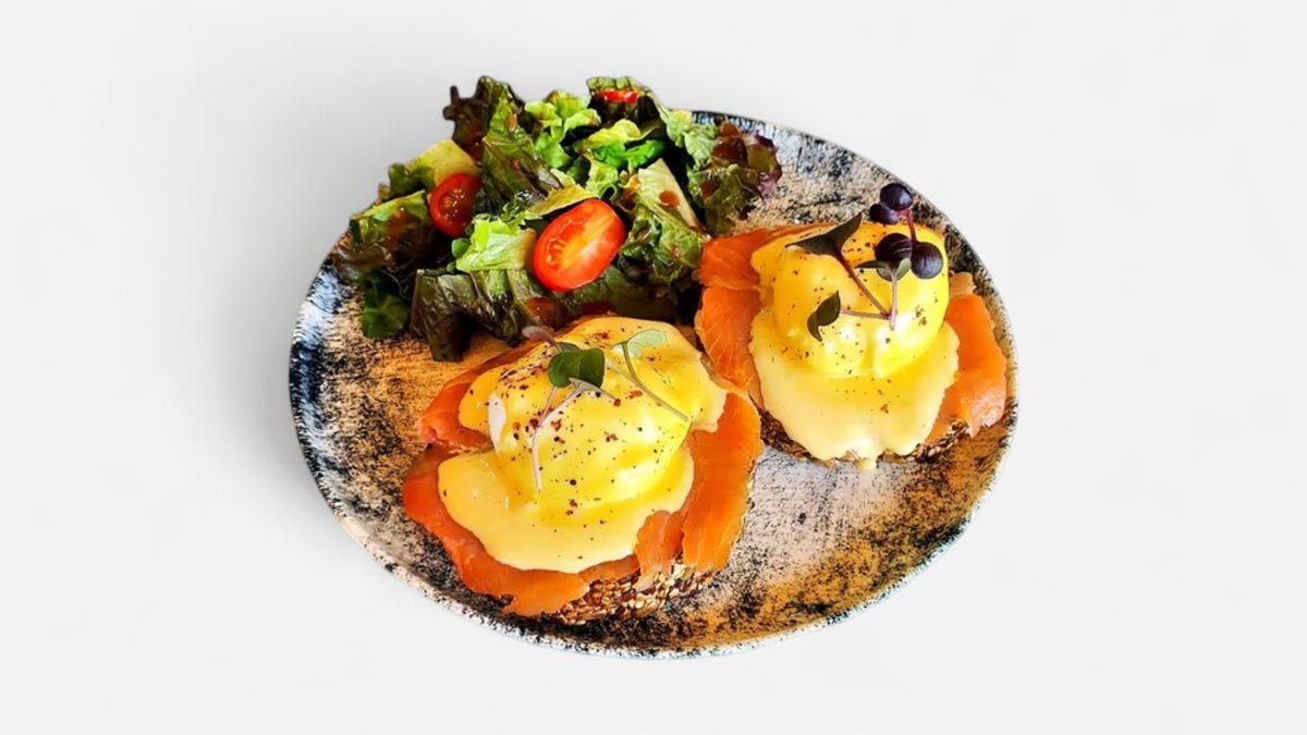 High protein bread, smoked salmon, poached eggs topped with hollandaise sauce, served with side salad.