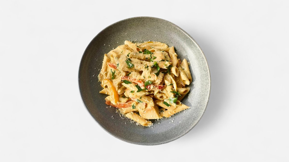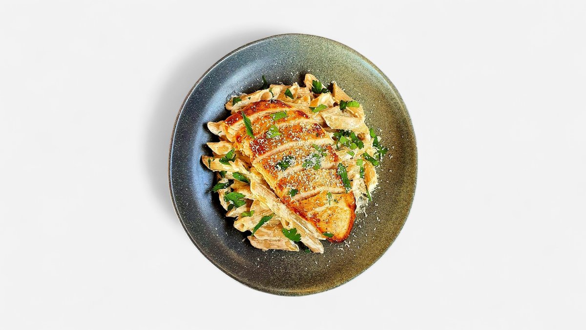 Brown pasta, pan seared lean chicken breast, creamy sauce Alfredo style, served with Parmesan and parsley.