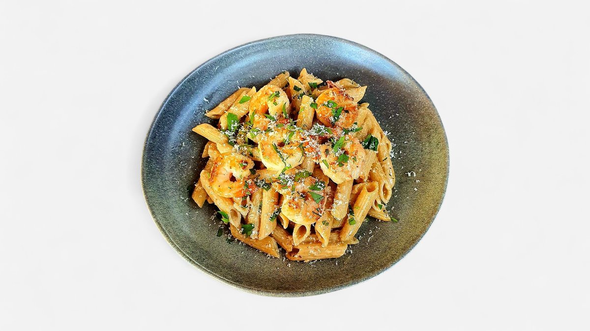 Brown pasta with pan seared shrimps in a simple yet indulgent sauce with garlic, served with Parmesan and parsley.