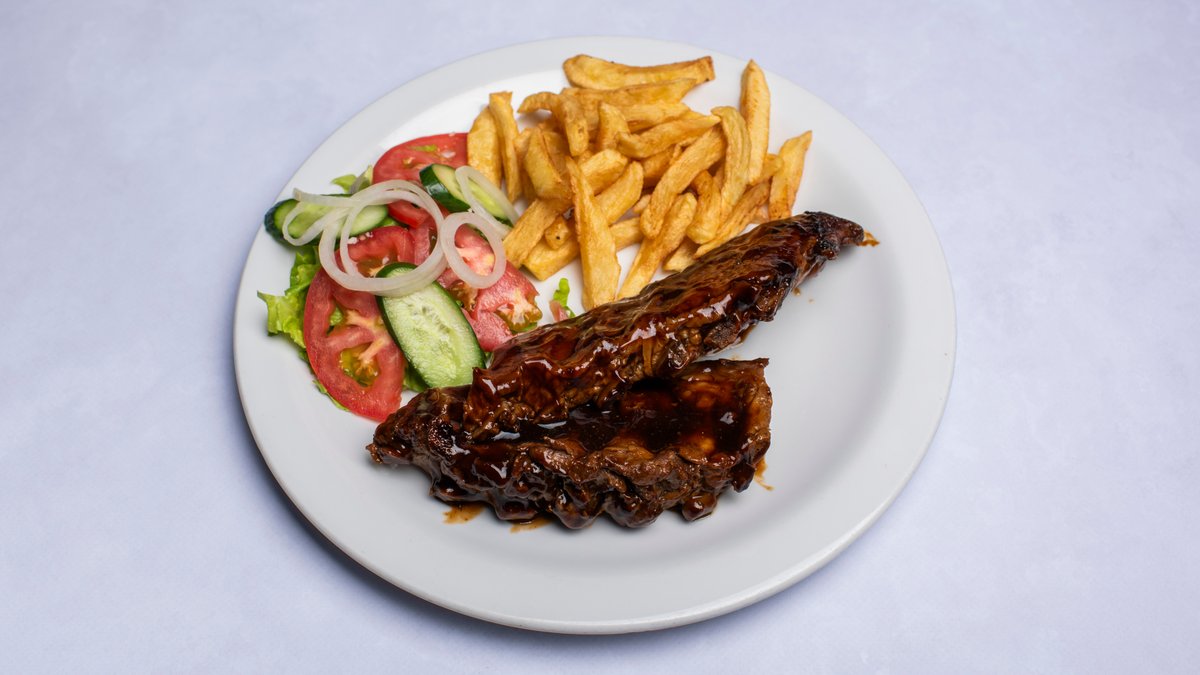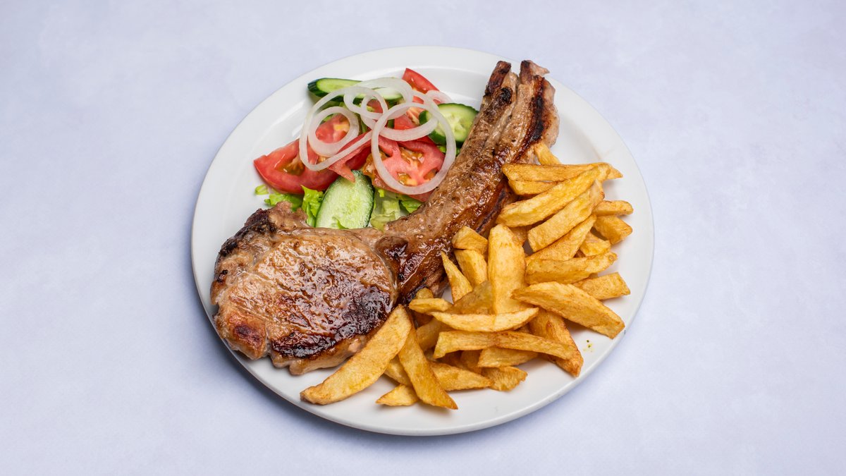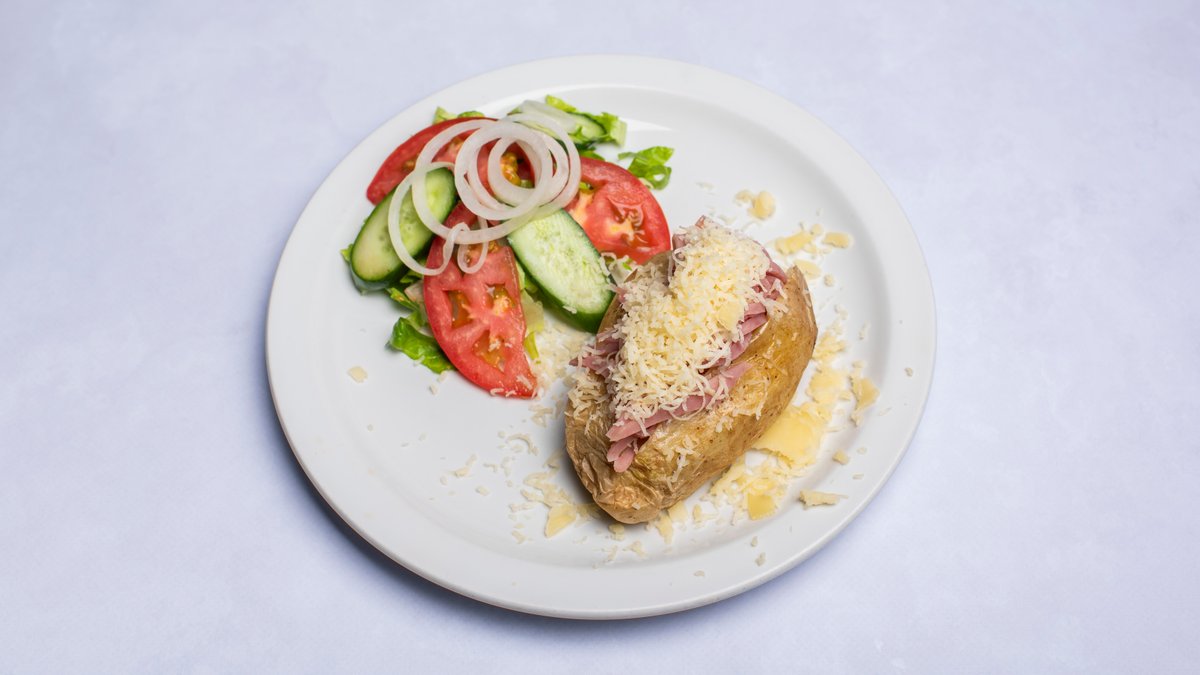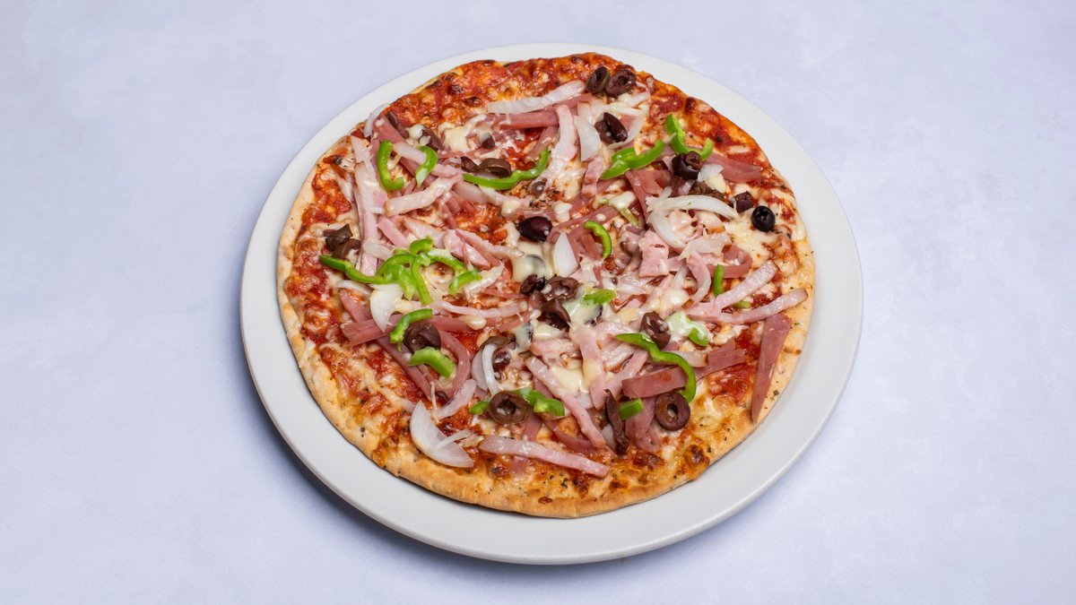 Ham, lountza, bacon, pepper, onion, olives, cheese and oregano