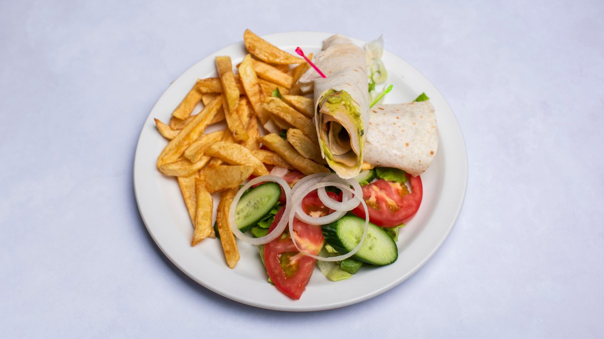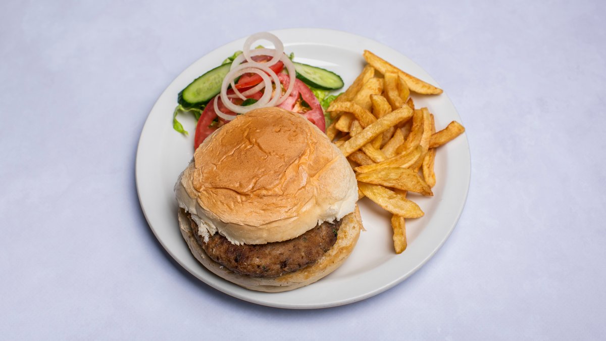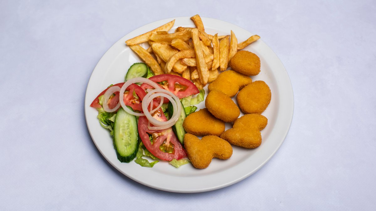 Lettuce, tomotoes, cucumbers, feta. cheese, onions, black olives, oregano