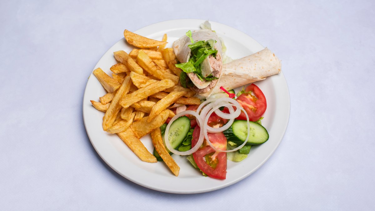 Lettuce, tomatoes, cucumbers, onions, peppers, black olives, tuna