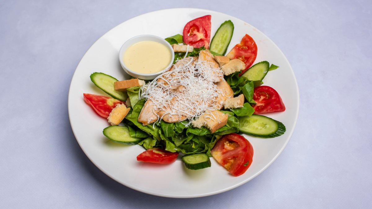Lettuce, tomatoes, cucumbers, dry anari cheese, caesar dressing
