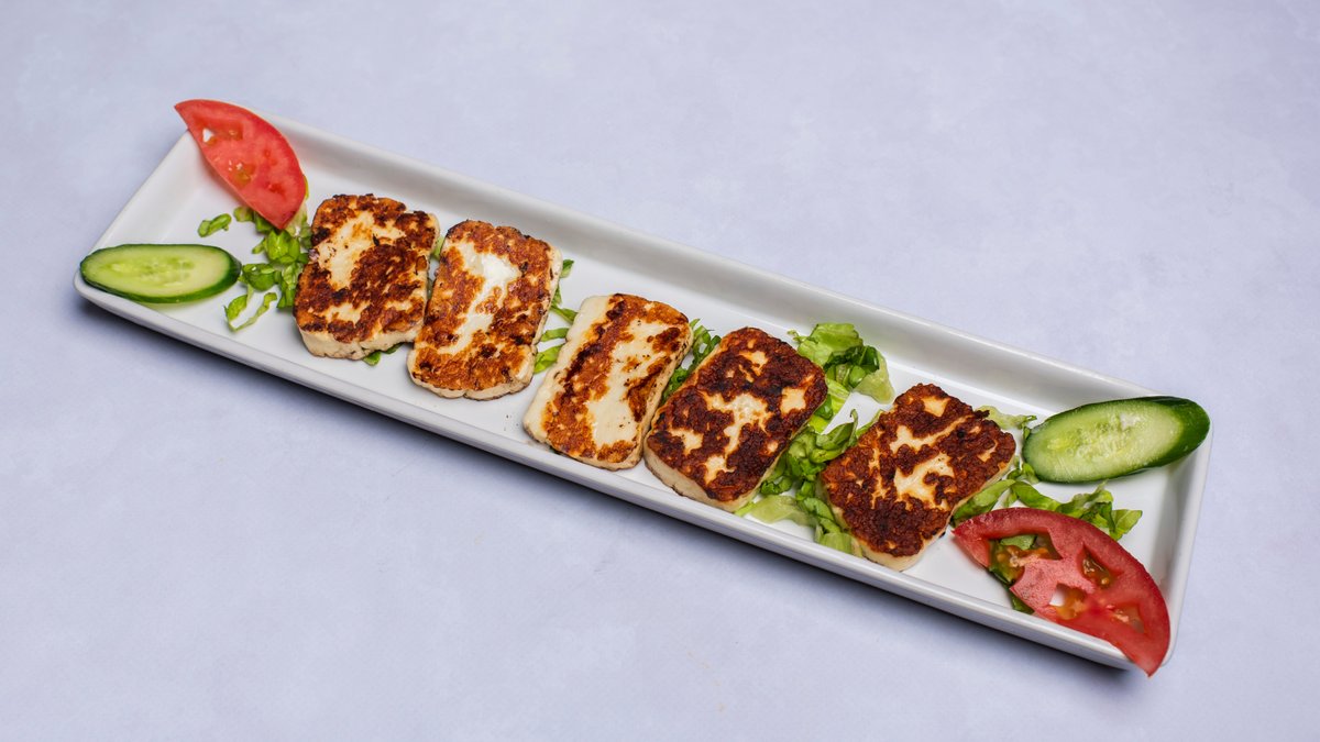 2 eggs, 2 pcs grilled halloumi, 2 pcs bacon, cyprus sausage, tomatoes, toast, butter
