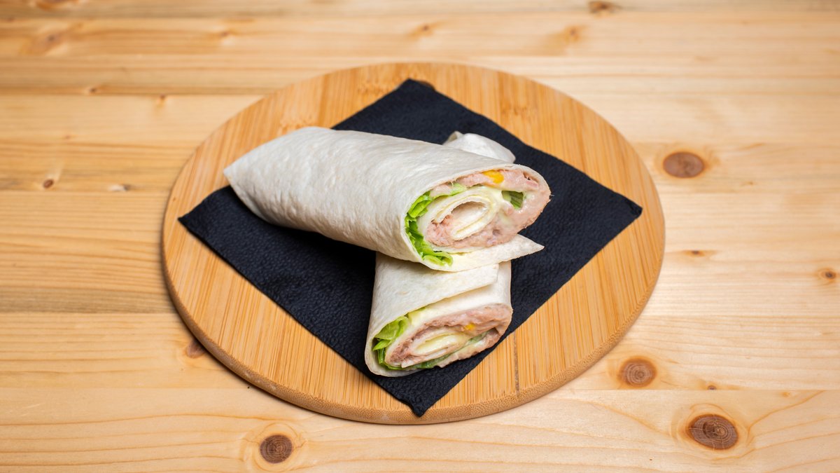Wrap with tuna, mustard mayonnaise, sweet corn and lettuce
