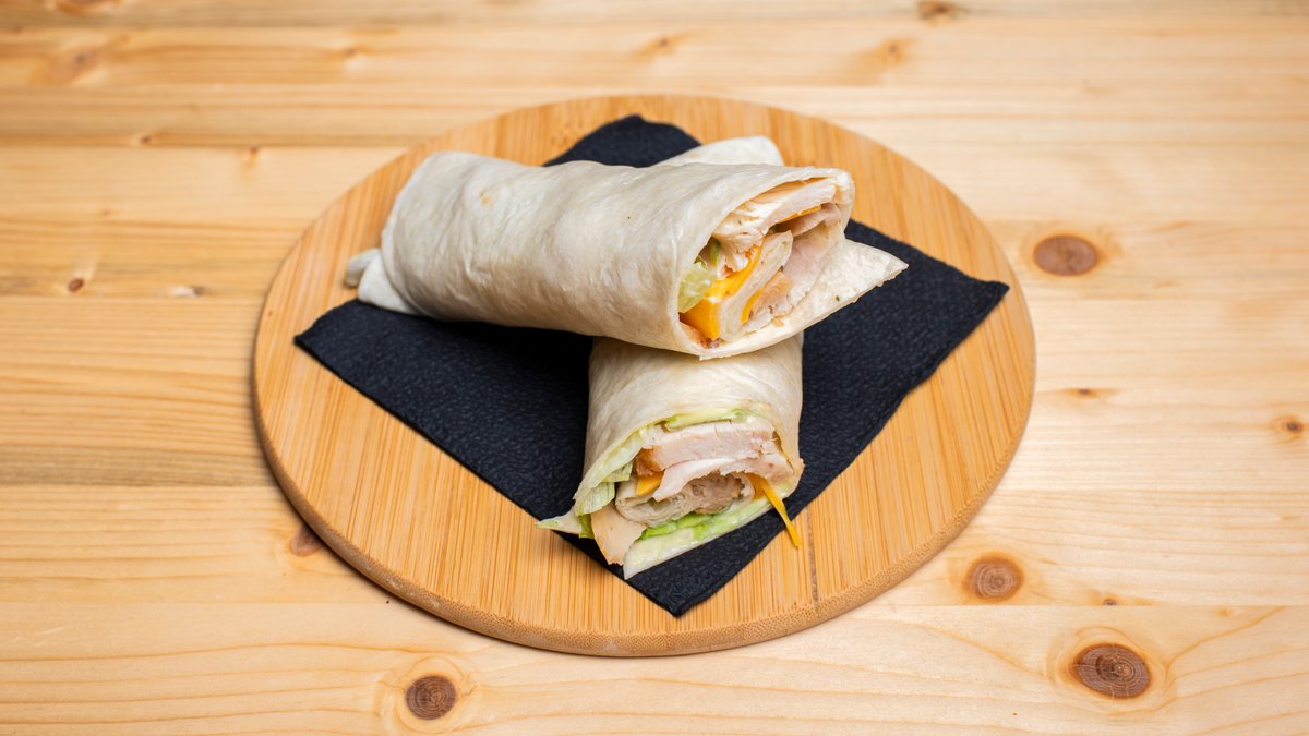 Wrap with chicken, caesar sauce, cheddar cheese, lettuce and tomato