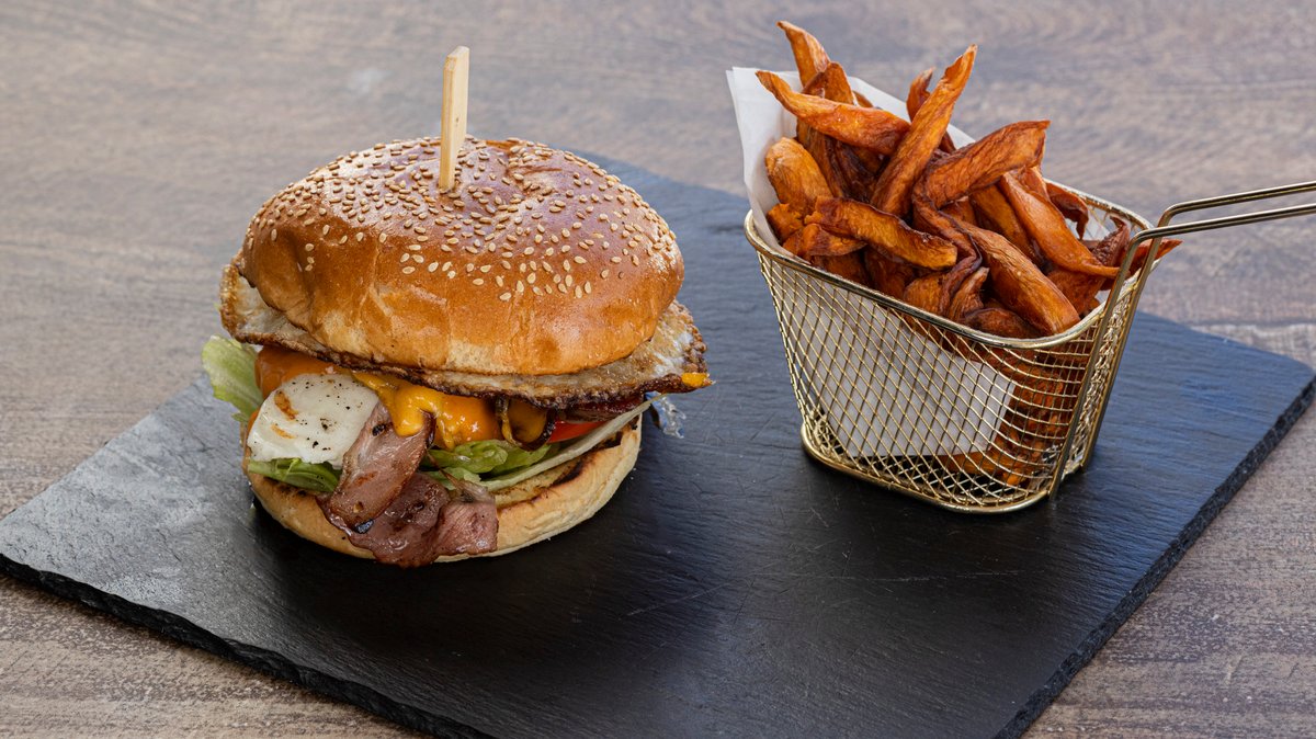 Τηγανητό μπιφτέκι από αυγο, μπέικον, λούντζα, τυρί τσένταρ, χαλούμι, iceberg, ντομάτα και τη σάλτσα μας, σερβιρισμένο σε ψωμάκι μπριός με γλυκοπατάτες