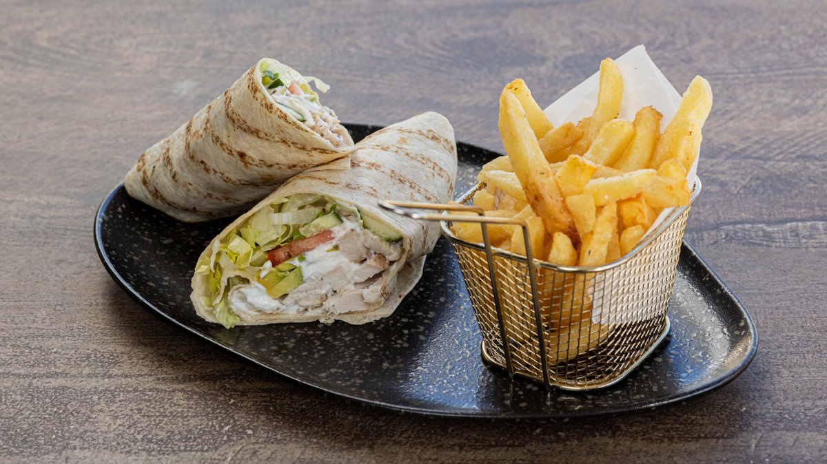 Ρίγες στήθος κοτόπουλου, αβοκάντο, ντομάτα, αγγούρι, iceberg, γιαούρτι και γλυκιά πάπρικα, σερβιρισμένα με συνοδευτική σαλάτα ή φρέσκες πατάτες