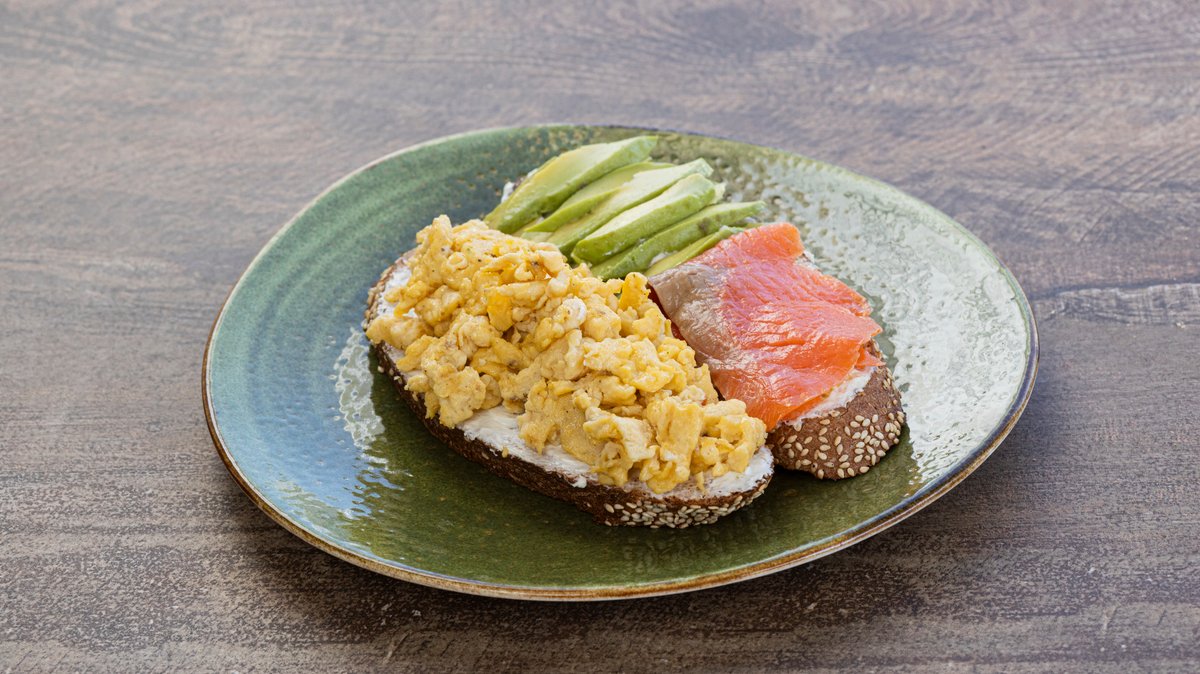 Ψωμί ολικής αλέσεως, με τυρί κρέμα, αβοκάντο και καπνιστό σολομό σερβιρισμένο με συνοδευτική σαλάτα ρόκα
