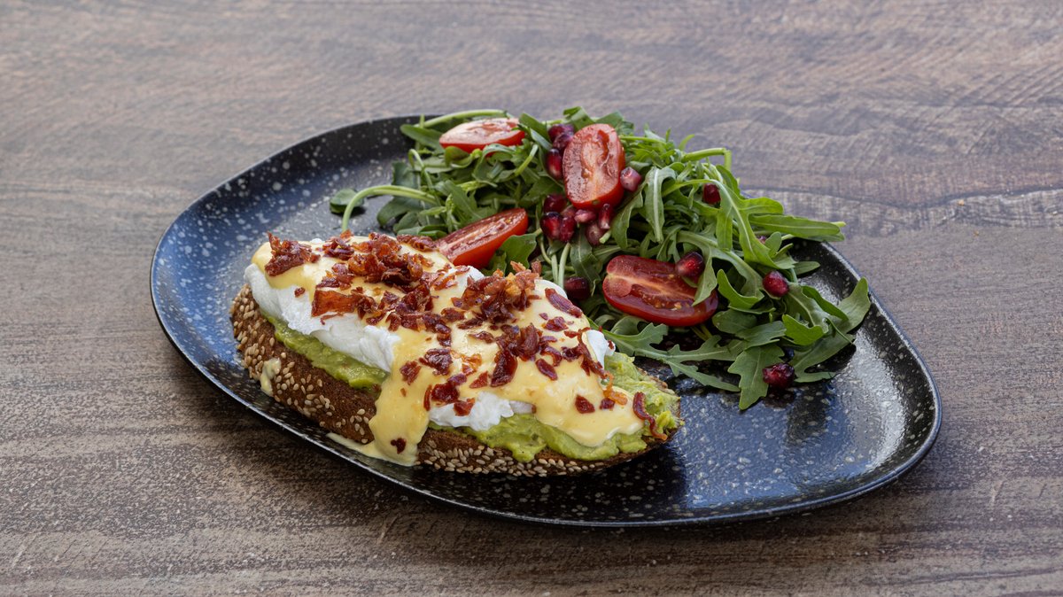 Ψωμί ολικής αλέσεως ψημένο με αλειμμένο αβοκάντο και αυγά ποσέ, σερβιρισμένα με σαλάτα ρόκα