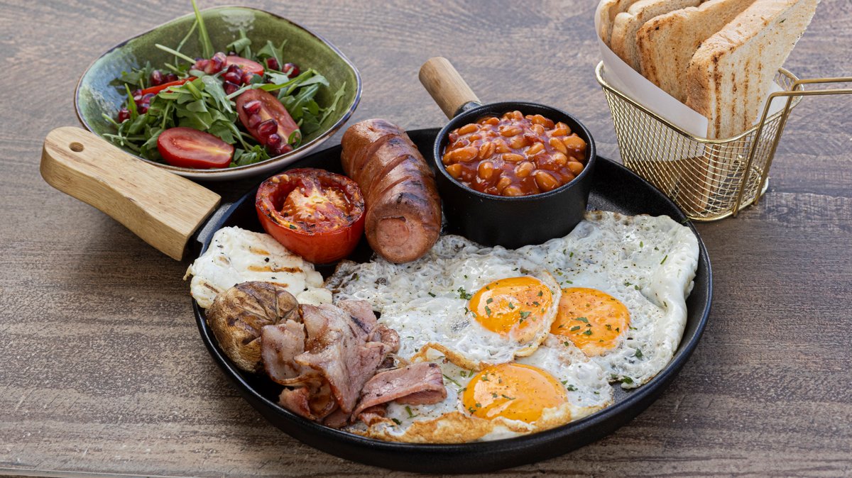 3 αυγά τηγανητά, μπέικον, γερμανικό λουκάνικο, φασόλια φούρνου, χαλούμι, μανιτάρι, ψητή ντομάτα, πράσινη συνοδευτική σαλάτα σερβίρεται με φρυγανισμένο ψωμί, βούτυρο και μαρμελάδα