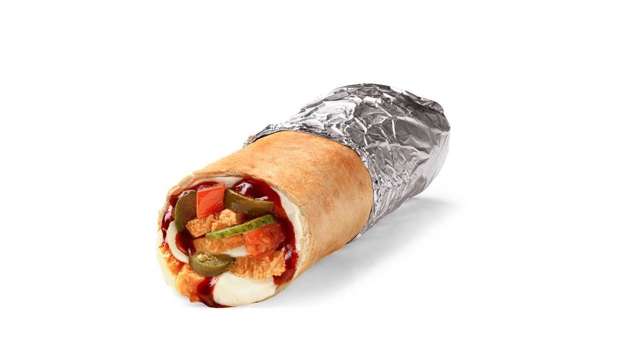 Wrap with chicken, mozzarella cheese, jalapenos, tomato, pickles and BBQ sauce