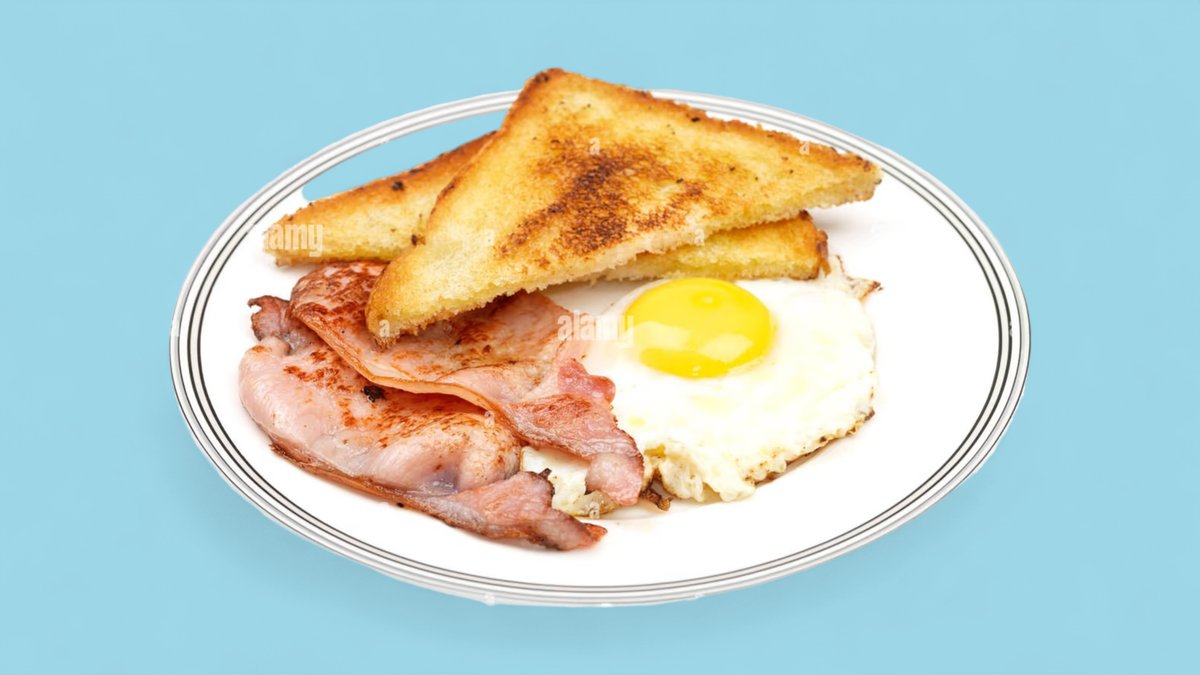 2 fried eggs, 2 slices baked bacon and 2 slices toasted bread