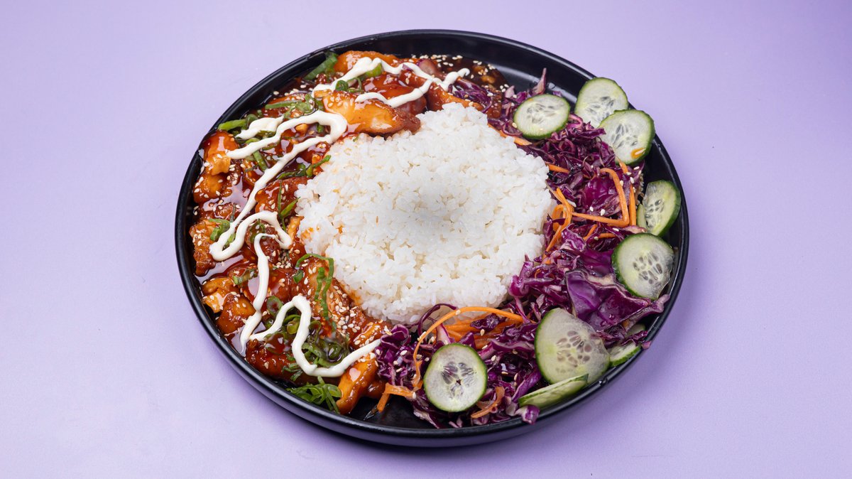 This dish includes 170g of Korean-style chicken in a homemade sweet and sour sauce, topped with spring onions and toasted sesame seeds. It’s served with 200g of steamed rice and a fresh Korean side salad.