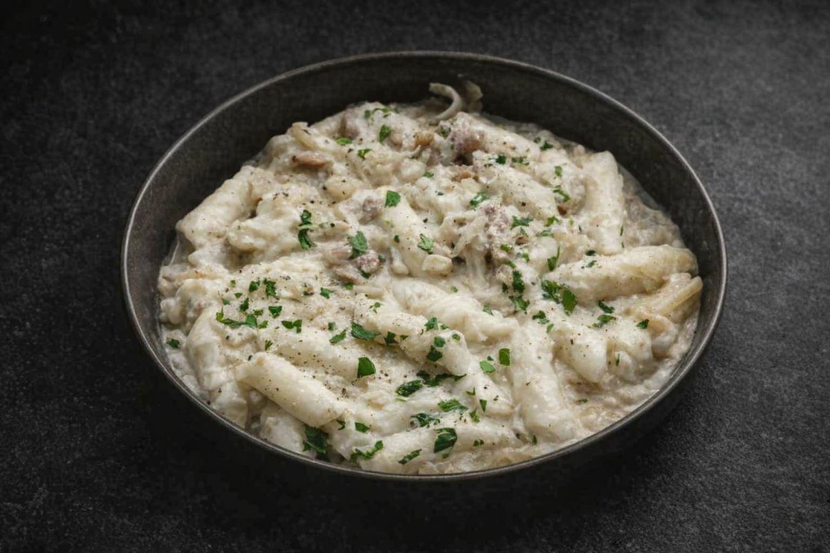 Korean slim Noodles with tteokbokki (rice cakes) mixed in garlic parmesan sauce with Bacon and vegetables