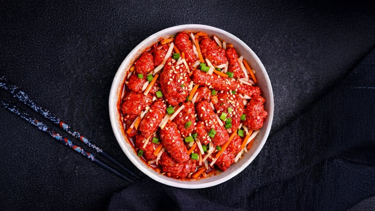 Sticky Korean BBQ sauce mixed with 250 grams of tteokbokki, traditional Korean rice cakes, served with 170 grams of crispy cooked chicken and vegetables.
