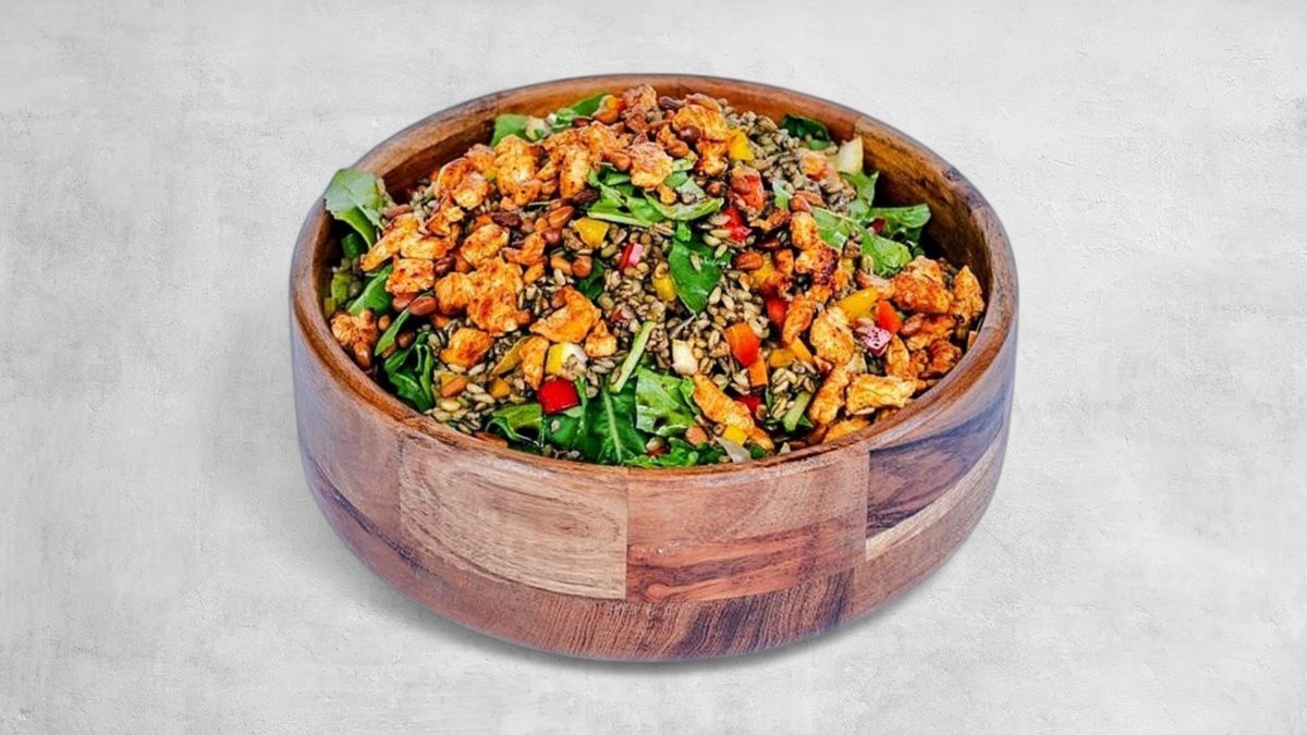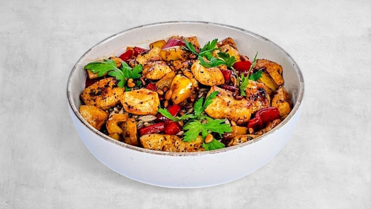 Chicken, fresh rocca, carrots, sweet pepper, onions, lemon slices, oil, vinaigrette lemon, freekeh