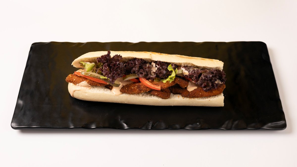 Fried breaded chicken, red coleslaw, tomatoes, lettuce, pickles.