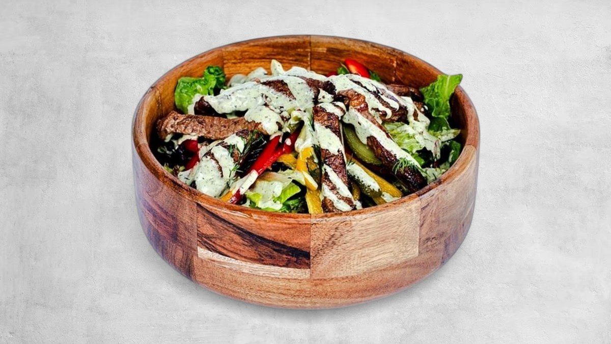 Rib Eye meat , lettuce, pickles, sweet pepper, red onions, sesame, oil, lemon, pesto dressing
