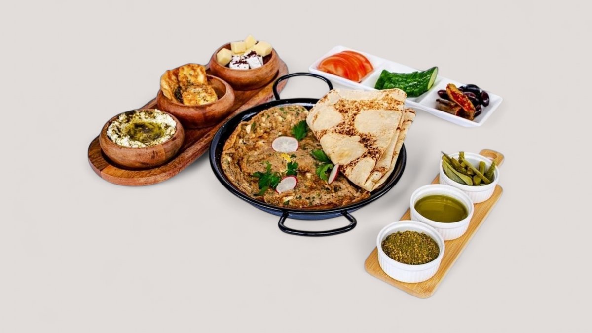 Omelette sided with feta cheese, haloumi , gouda, labneh (yogurt), halava , zaatar, olive oil, makdous, vegetables.