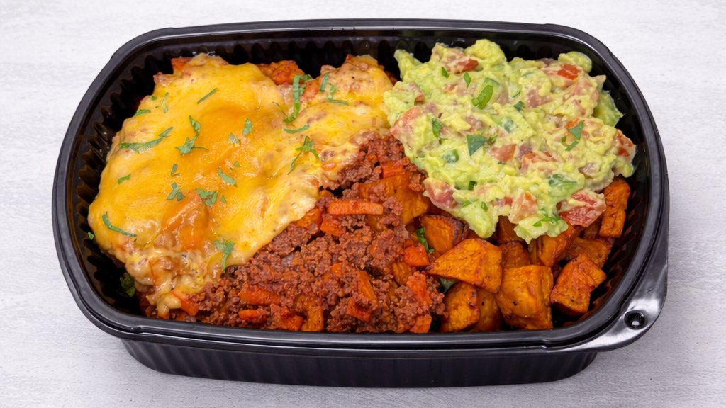Ψητή γλυκοπατάτα με κιμά μοσχαρίσιο (κρεμμύδι, ντομάτα, καρότο), γκουακαμόλε (αγγούρι, ντομάτα) s/p.