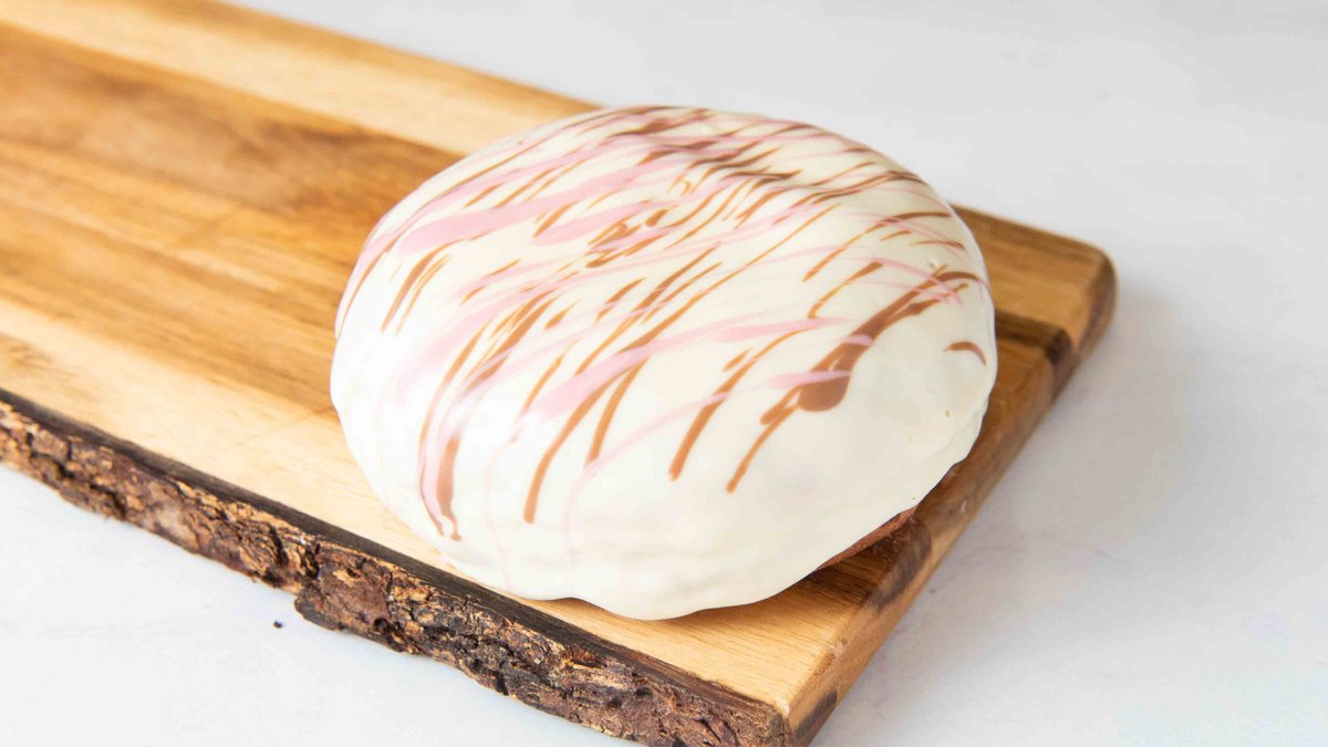 Praline and raspberry filling, with white chocolate glazing and pink lines and chocolines topping