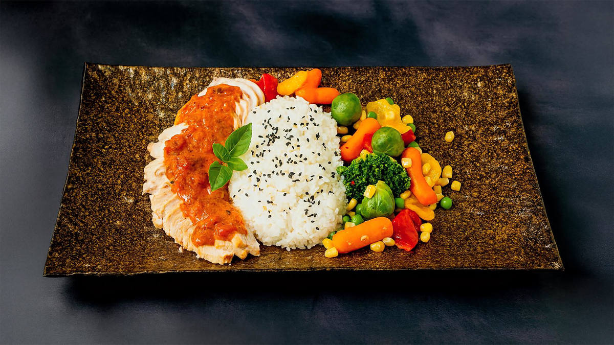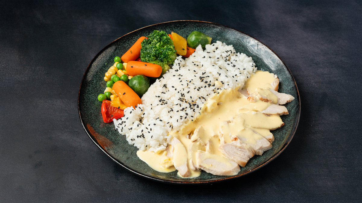 180 grams of steamed chicken with an ultra–low‑calorie sauce made from ,O% fat yogurt,yellow bell pepper and herbs. Served with 180 grams of steamed rice and 180 g of steamed vegetables. ---------------------------------------------------------------------- Calories 612 Protein 74 g Carbs 84 g