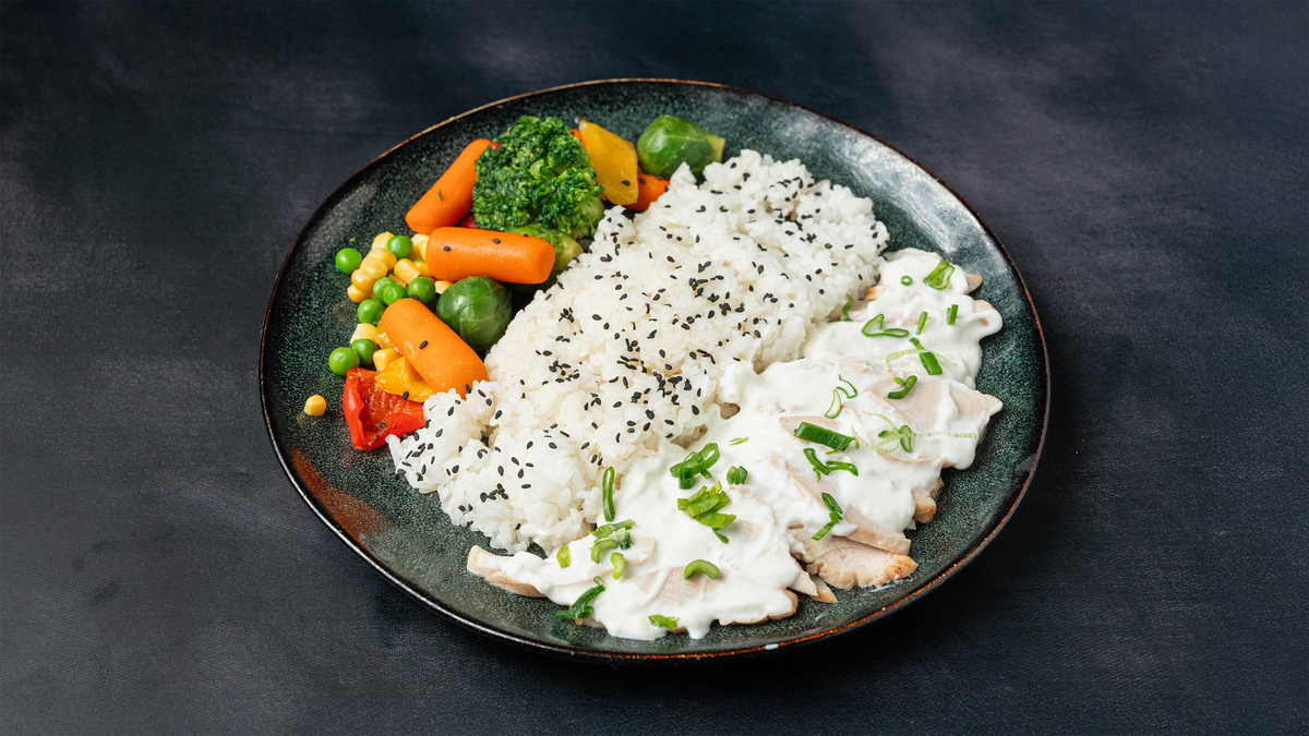 180 grams of steamed chicken with an ultra–low‑calorie sauce made from ,O% fat yogurt, garlic and herbs. Served with 180 grams of steamed rice and 180 g of steamed vegetables. ---------------------------------------------------------------------- Calories 617 Protein 74 g Carbs 83 g