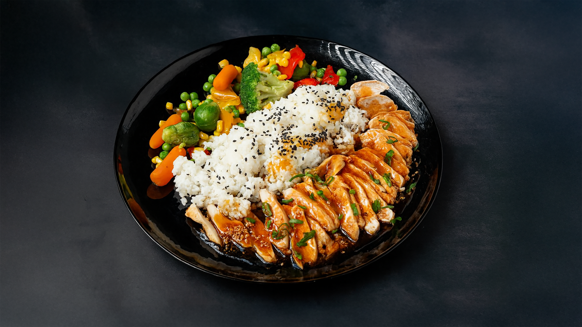 180 grams of steamed chicken with an ultra–low‑calorie sauce made from real honey and sesame seeds. Served with 180 grams of steamed rice and 180 g of steamed vegetables. ------------------------------------------------------------------- Calories 634 Protein 67 g Carbs 87g