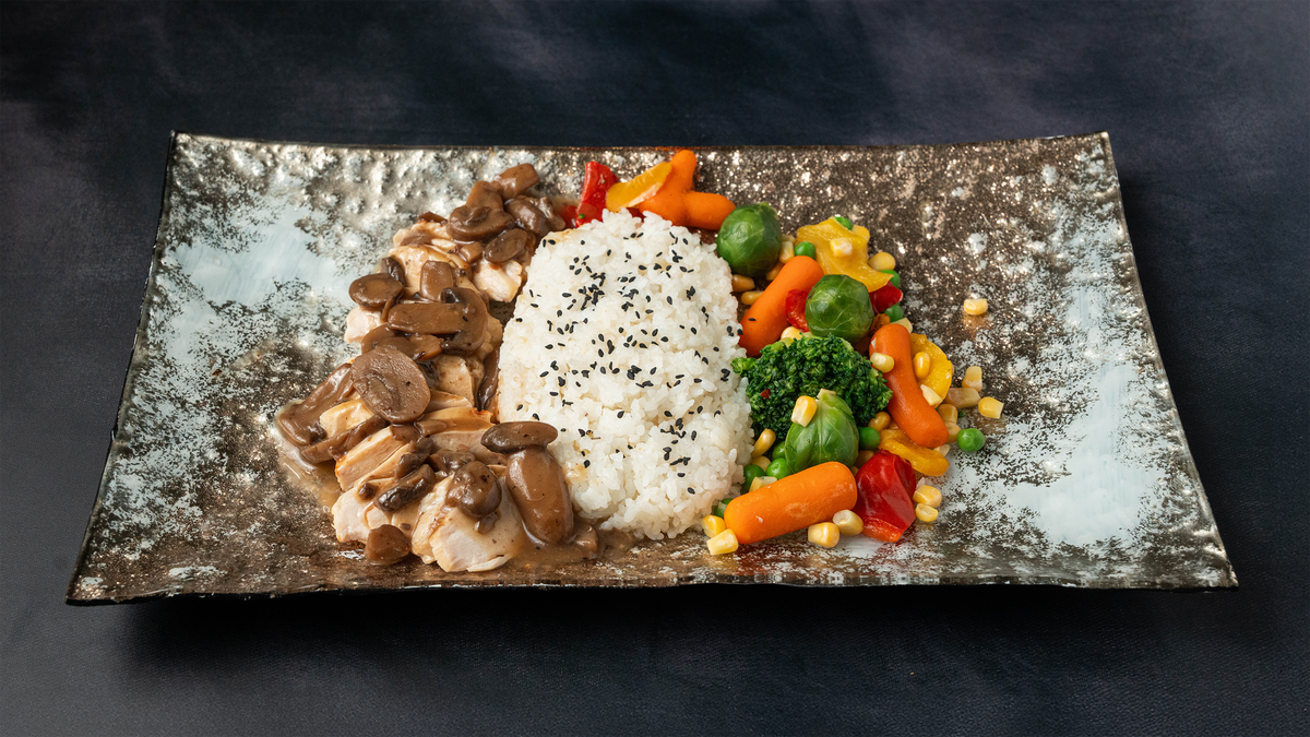 180 grams of steamed chicken with an ultra–low‑calorie sauce made from white wine ,mushroom,and herbs . Served with 180 grams of steamed rice and 180 g of steamed vegetables. ------------------------------------------------------------------- Calories 617 Protein 67 g Carbs 84g
