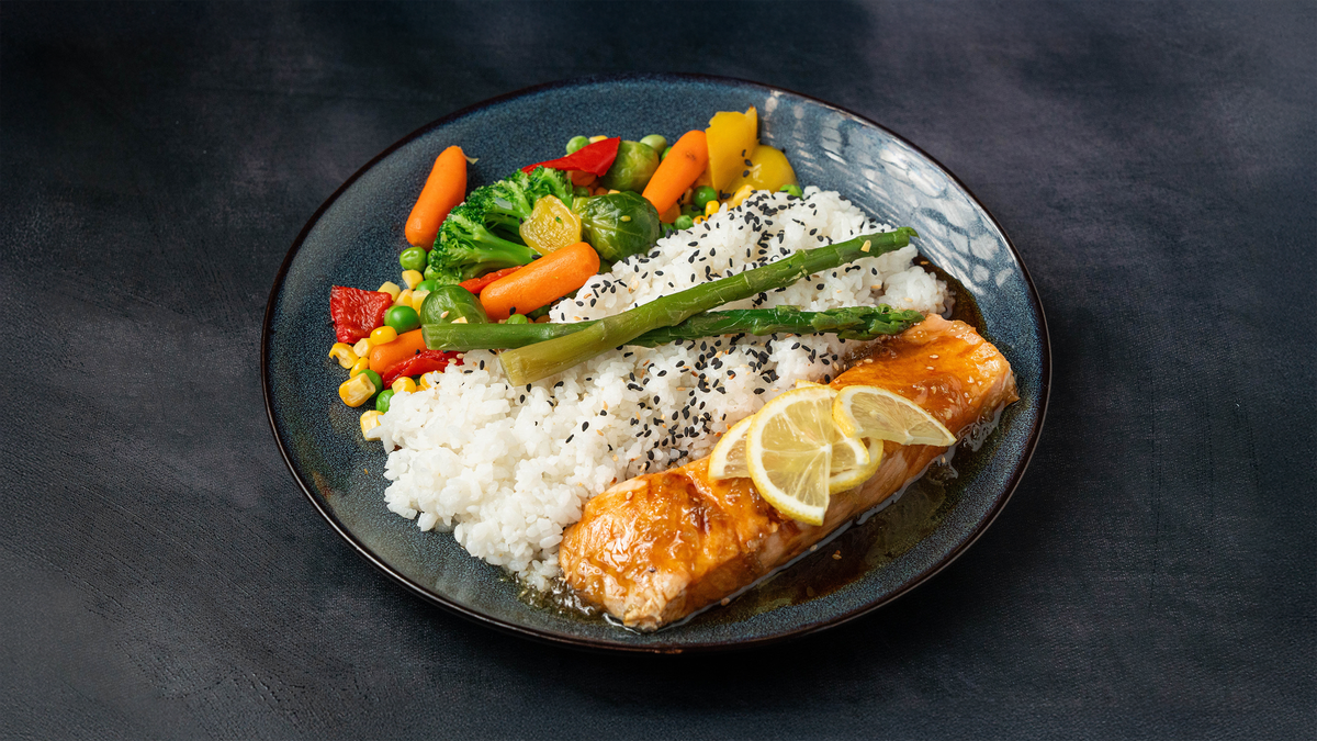200 grams of steamed high‑quality Norwegian salmon with an ultra–low‑calorie sauce made from honey, garlic and herbs.Served with 180 grams of steamed rice and 180 g of steamed vegetables. ------------------------------------------------------------------- Calories 694 Protein 60 g Carbs 82g