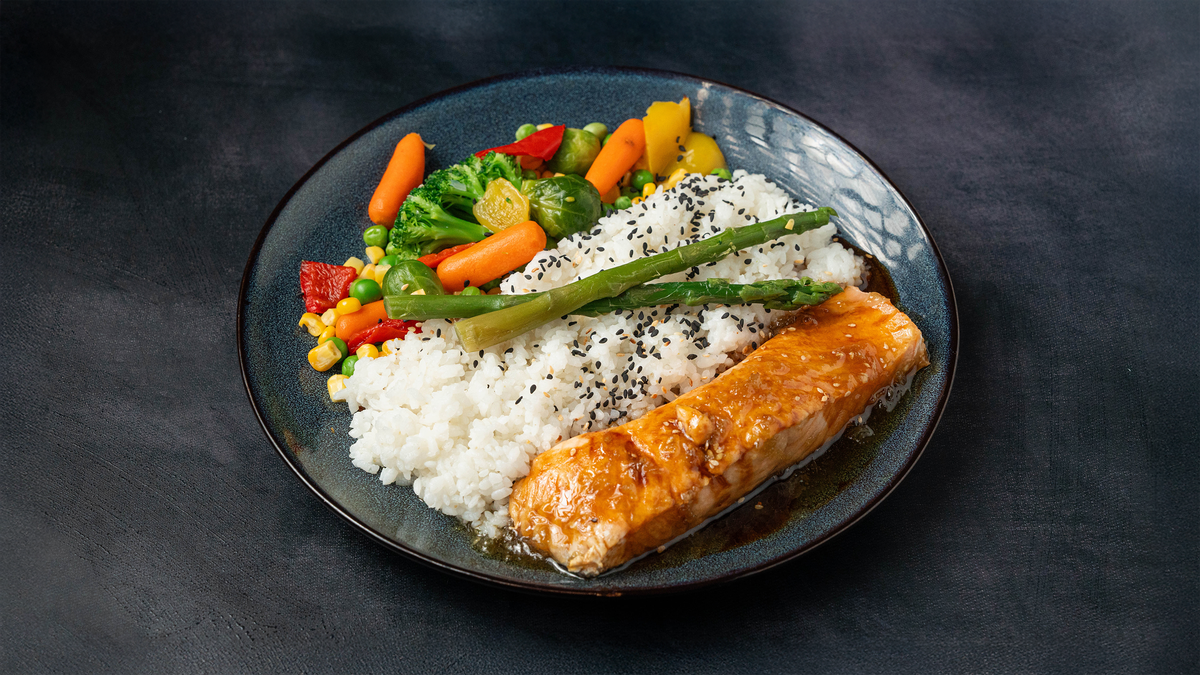 200 grams of steamed high‑quality Norwegian salmon with an ultra–low‑calorie real JapaneseTeriyaki sauce.Served with 180 grams of steamed rice and 180 g of steamed vegetables. ------------------------------------------------------------------- Calories 697 Protein 60 g Carbs 81g