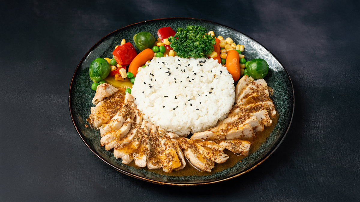 180 grams of steamed chicken with an ultra–low‑calorie sauce made from white wine Dijon mustard sauce.Served with 180 grams of steamed rice and 180 g of steamed vegetables. ------------------------------------------------------------------- Calories 624 Protein 68 g Carbs 79 g