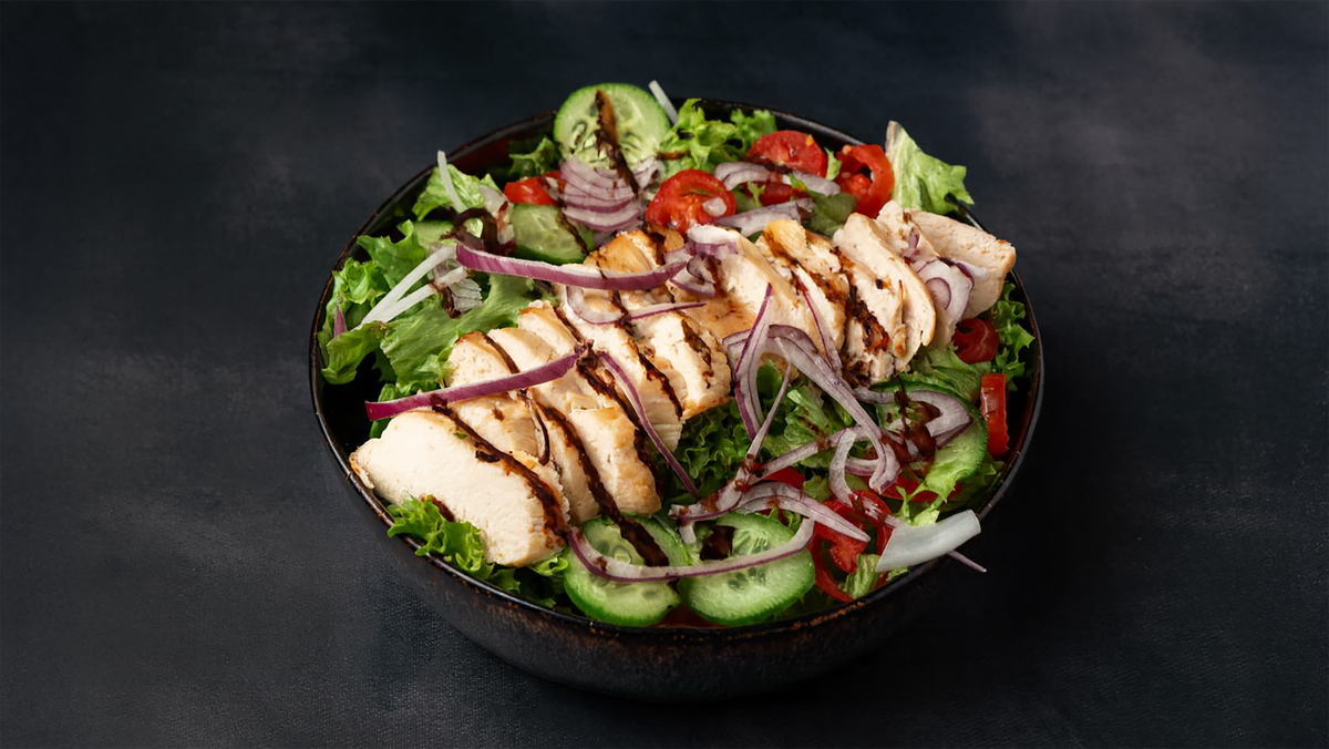 Green Lolloroso, tomatoes, cucumber, and finely sliced red onions tossed in our homemade low‑calorie balsamic vinaigrette sauce, served with 170 g of tender steamed chicken for a light and satisfying dish. -------------------------------------------------------------------- Calories : 340 Protein : 50 g Carbs : 12 g