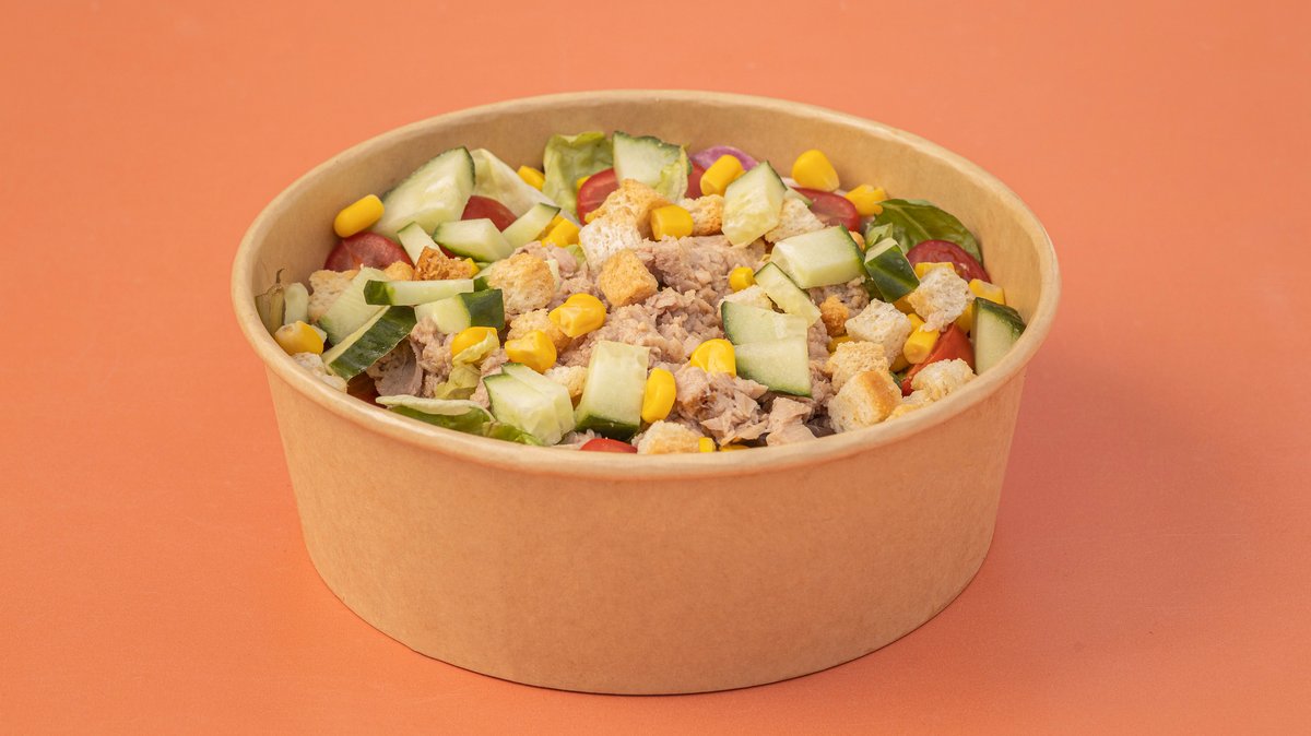 Σαλάτα τόνου με ντοματίνια, αγγούρι, καλαμπόκι, κρεμμύδι, κρουτόν και σάλτσα λεμονιού και ελαιολάδου