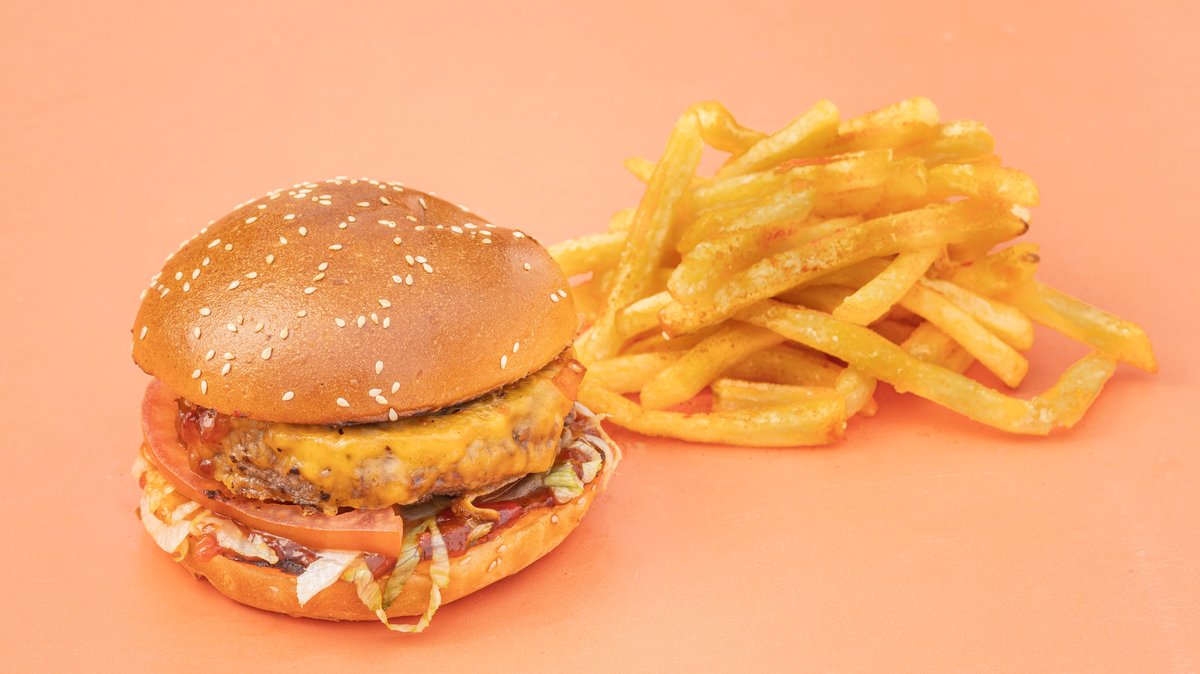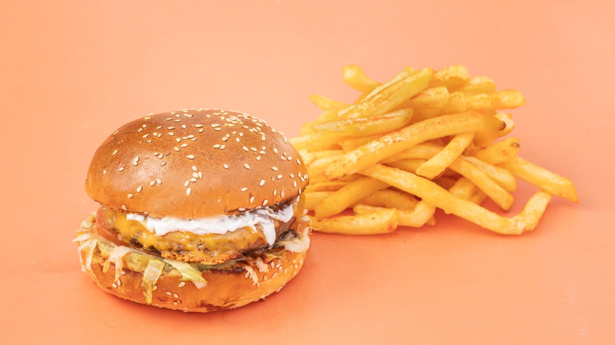 170 γρ. μοσχάρι Black Angus Burger, τυρί τσένταρ, iceberg, ντομάτες, τουρσί κρεμμύδια, κέτσαπ, μουστάρδα και μαγιονέζα