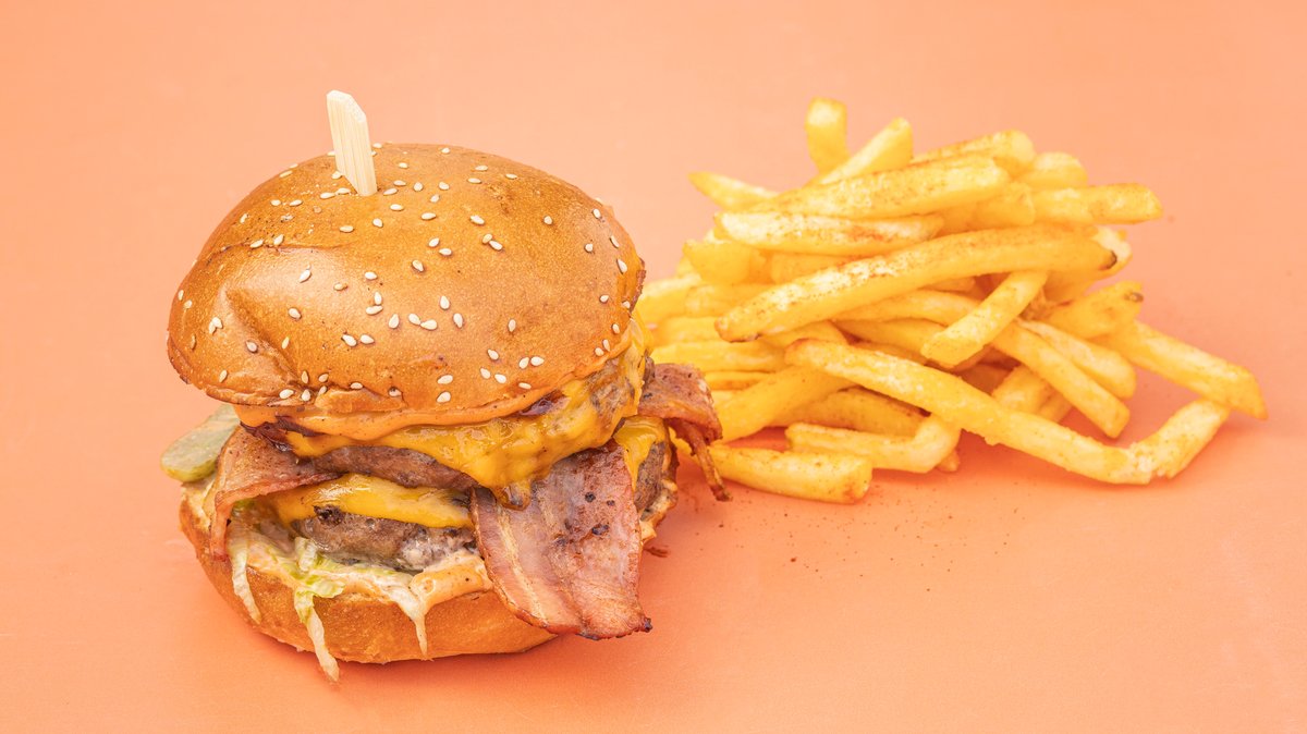 170 γρ. μοσχάρι Black Angus Burger, τυρί τσένταρ, μπέικον, κρεμμύδι με κρεμμύδι, iceberg, ντομάτα, τουρσί, κέτσαπ, μουστάρδα και μαγιονέζα
