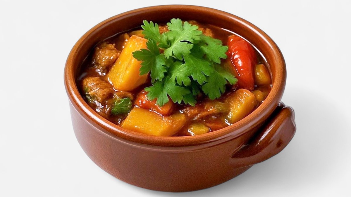 Lamb meet, potato, eggplants, sweet pepper, garlic, herbs, tomato paste
