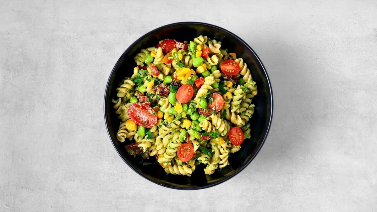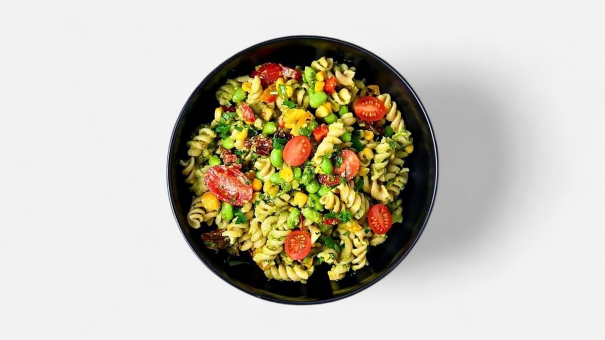 Ingredients: Whole wheat macaroni, cherry tomatoes, bell peppers, sun-dried tomatoes , corn, edamame beans, mashed avocado, parsley . Nutritional Value (per serving): • Calories: 829 kcal • Protein: 30 g • Carbohydrates: 160 g • Fat: 15.4 g • Fiber: 18.5 g *vegan
