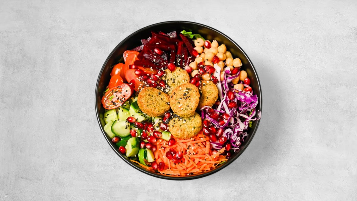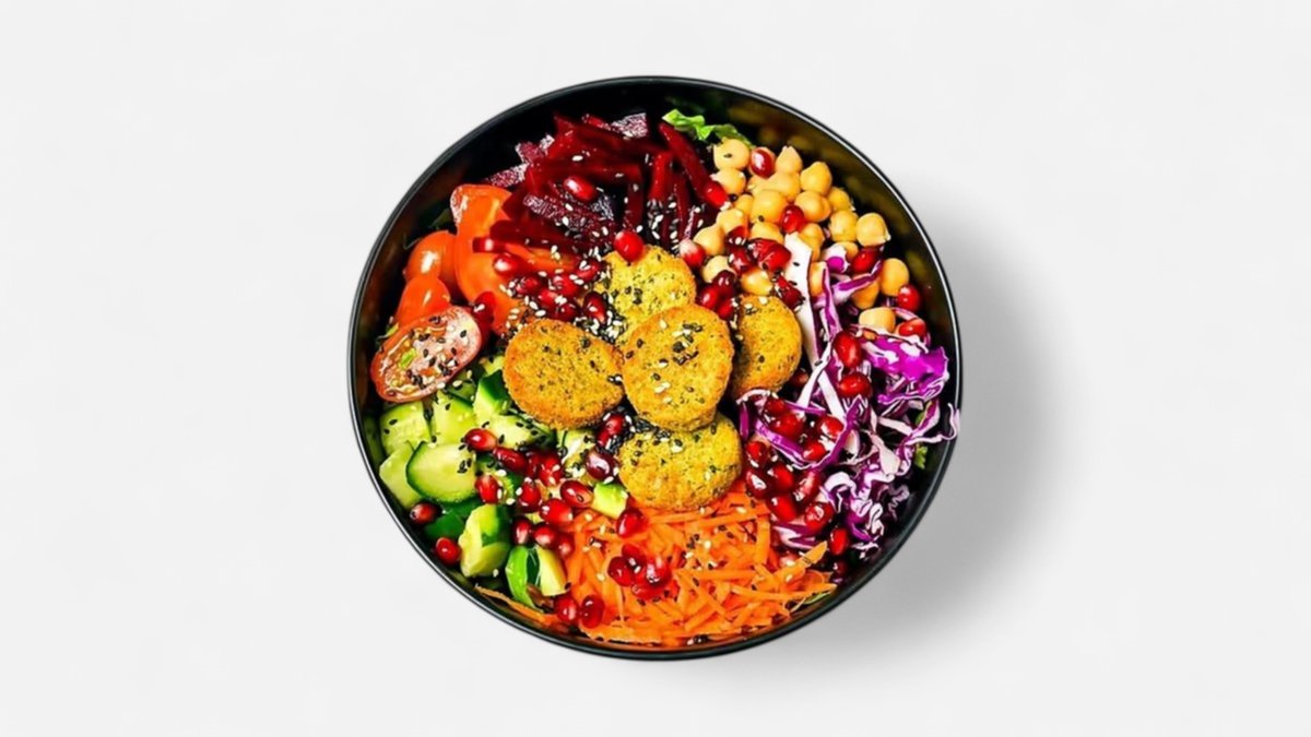Ingredients: Fresh greens, red cabbage, carrots, falafel (5 pcs), cucumber, cherry tomatoes, pickled beetroots, chickpeas, pomegranate seeds. Topped with sesame seeds. Nutritional Value (per serving): • Calories: 319 kcal • Protein: 11.4 g • Carbohydrates: 42.8 g • Fats: 13.2 g • Fiber: ~7 g