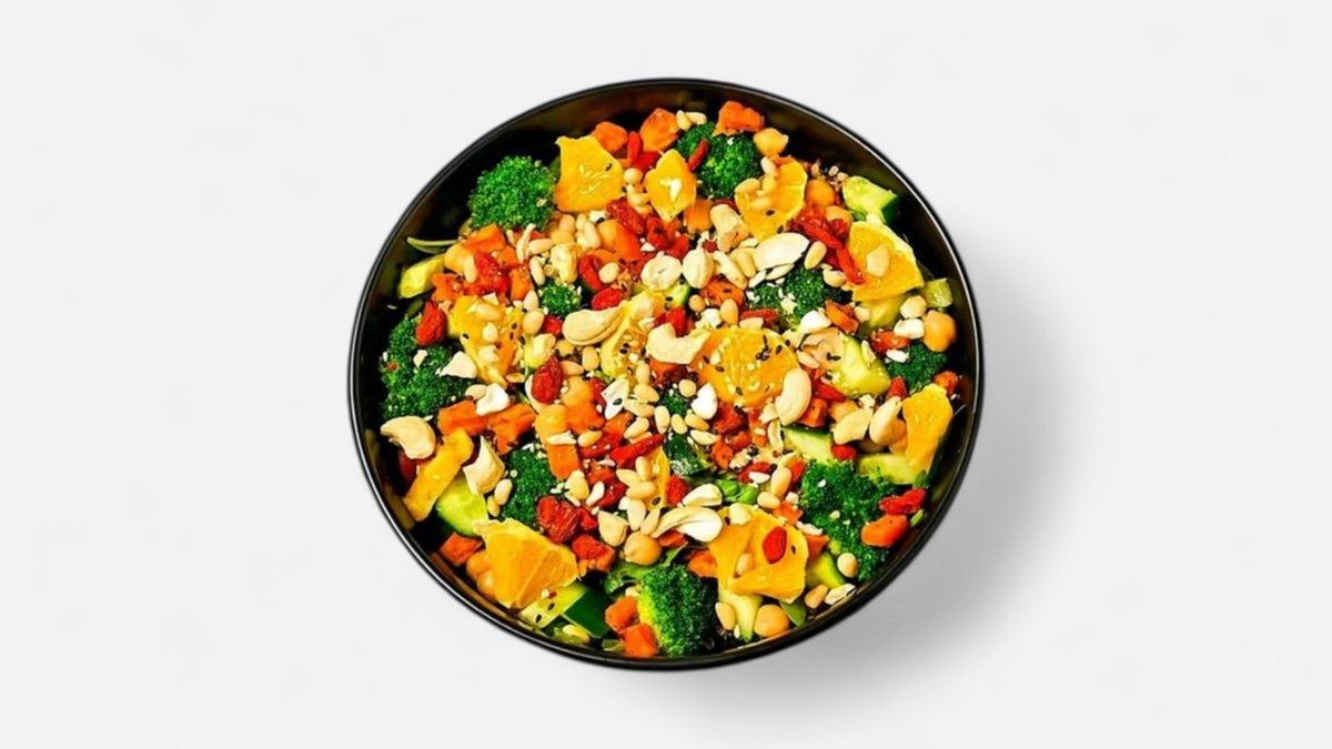 Ingredients: Lettuce, tricolour quinoa, roasted sweet potatoes, steamed broccoli, chickpeas, fresh cucumber, orange slices, mixed nuts, and goji berries.