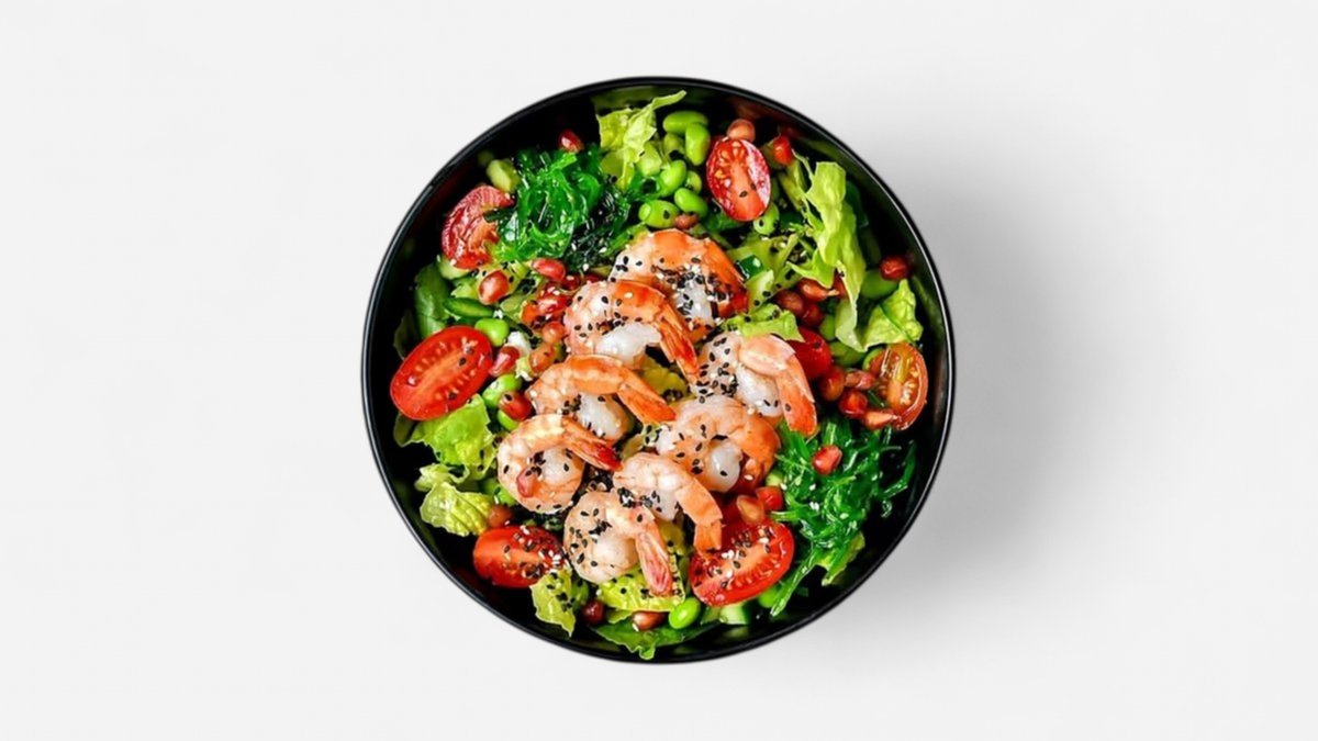 Ingredients: Shrimp, tricolor quinoa, lettuce, cucumber, cherry tomatoes, edamame, pomegranate, seaweed, sesame seeds. Nutritional Value (per serving): • Calories: 390 kcal • Protein: 35.4 g • Carbs: 46.1 g • Fat: 8.1 g • Fiber: 8.9 g
