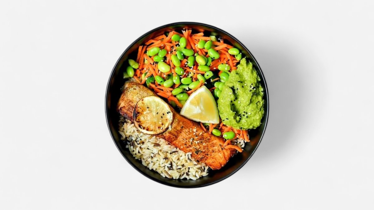 Ingredients: Shredded Carrots, cucumber, smashed avocado, edamame, wild rice or tricolour quinoa , salmon, lemon wedge , sesame seeds . Nutritional Value (per serving): • Calories: 484 kcal • Protein: 34.9 g • Carbohydrates: 34.9 g • Fats: 23.9 g • Fiber: 8.6 g