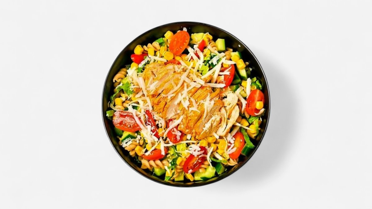 Ingredients: Whole wheat fusilli pasta, grilled chicken breast 100g , fresh vegetables (lettuce, cucumbers, cherry tomatoes), corn , shredded halloumi. Nutritional Value (per serving): • Calories: 612 kcal • Protein: 50.3 g • Carbohydrates: 77.8 g • Fat: 11.1 g • Fiber: 6.2 g