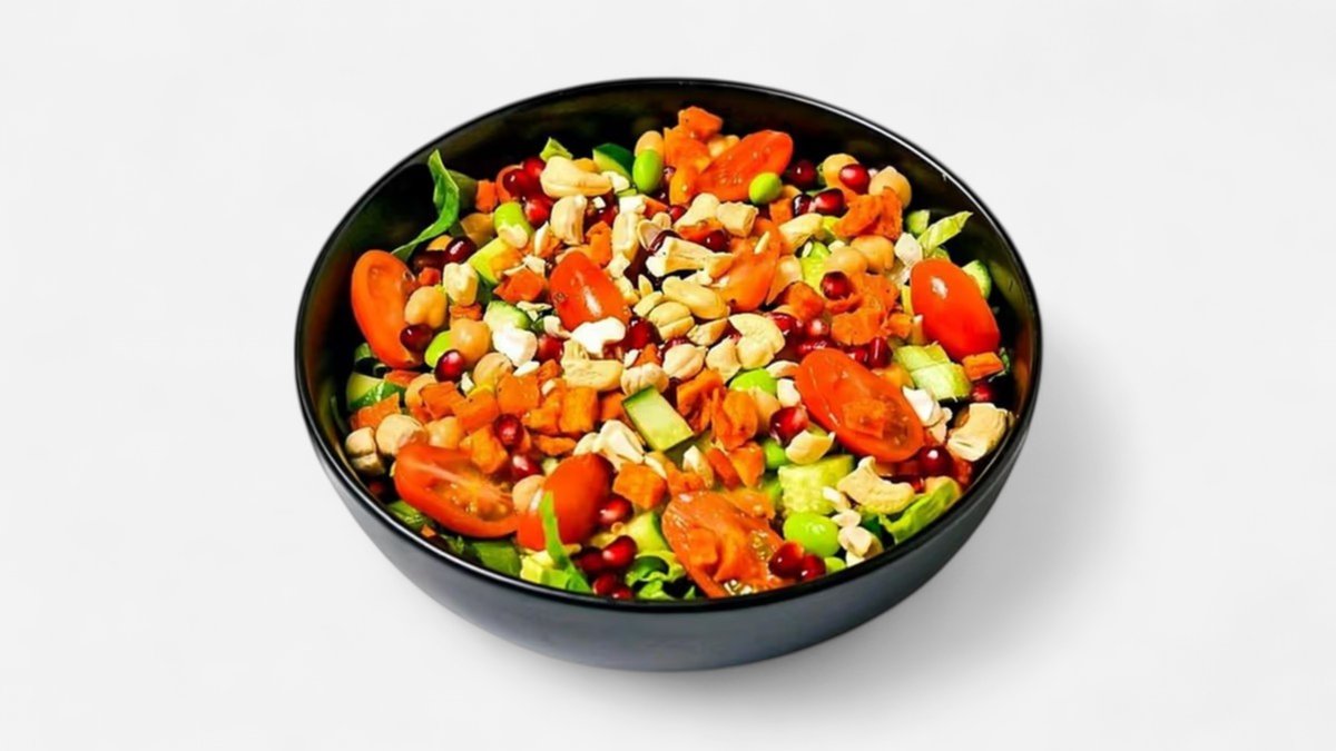 Ingredients: Lettuce, cucumber, cherry tomatoes, roasted sweet potato cubes, edamame beans, chickpeas, tricolor quinoa, pomegranate seeds, crushed cashews . ✅ Rich in Plant-Based Protein – Chickpeas, edamame, and quinoa provide essential amino acids for muscle recovery and energy. ✅ Antioxidant Boost – Pomegranate seeds and cherry tomatoes support skin health and strengthen immunity. ✅ Healthy Fats & Crunch – Cashews add a satisfying crunch and heart-healthy fats. ✅ Sustained Energy – Sweet potatoes and quinoa offer fiber-rich, slow-releasing carbohydrates for lasting fullness. *vegan