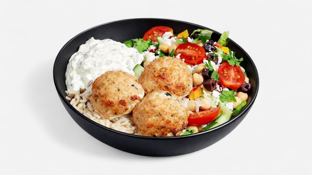 Ingredients: Wild rice or tricolor quinoa, your choice of protein (chicken meatballs, grilled chicken breast, or grilled salmon), lettuce, cherry tomatoes, cucumber, bell peppers, chickpeas, Kalamata olives, crumbled bio feta, tzatziki, and fresh parsley. Notice: Please note that our current dish includes three larger meatballs, while the images may show five smaller ones. Thank you for your understanding.